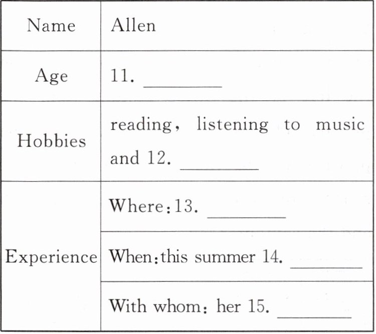 (三)听下面一段独白,根据所听到的信息完成下面的表格,每空一词。听独白前,你有 20 秒钟的时间阅读各个小题。独白读两遍。(10 分)