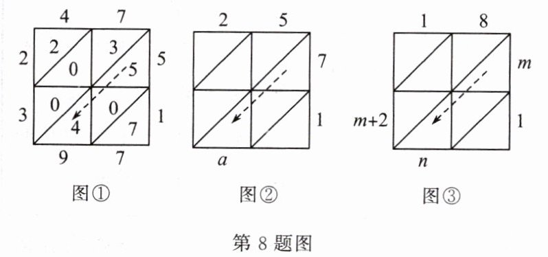 8. “格子乘法”作为两数相乘的一种计算方法,在明代的《算法统宗》一书中被称为“铺地锦”。如图①,计算$47×51$,将乘数 47 计入上行,乘数 51 计入右列,然后用 47 的每位数字分别乘 51 的每位数字,将结果计入相应的格子中,最后按斜行加起来,得 2397。类比解决下列问题: