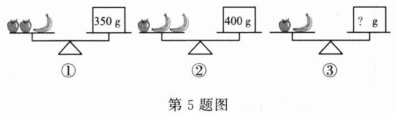 5. 如图,在天平上放若干苹果和香蕉,其中①②的天平保持平衡,现要使③中的天平也保持平衡,需要在天平右盘中放入砝码(
