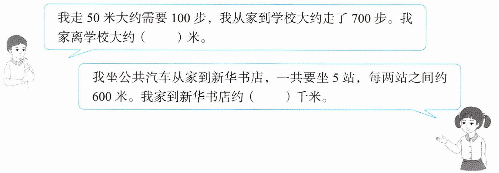 我走50米大约需要100步,我从家到学校大约走了700步。我家离学校大约( )米。
