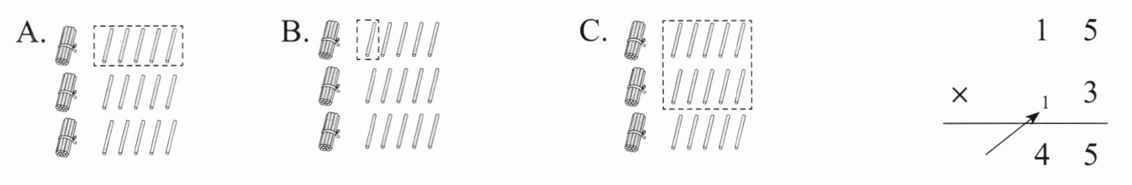 (2)用竖式计算$15×3$时,进位的“1”相当于图( )中圈出的部分。