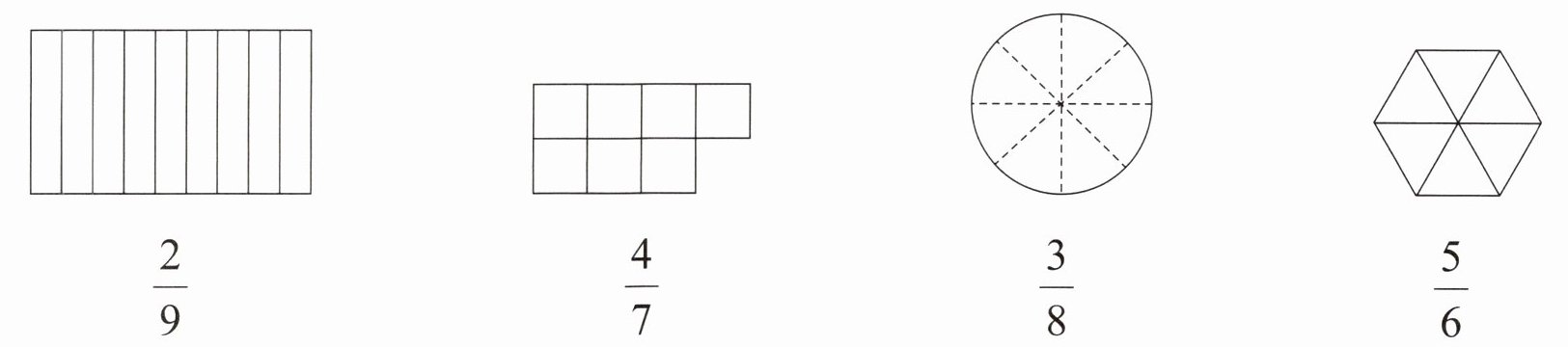 1. 第一个图形(分数 $\dfrac{2}{9}$):将矩形的9个相等竖条中的2个涂色。