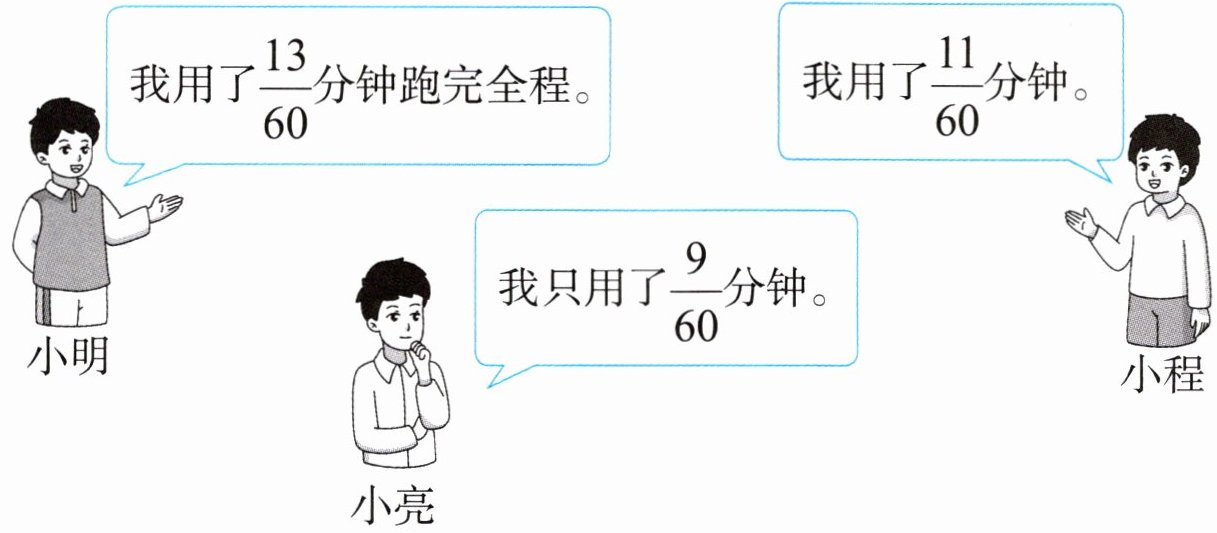 小明:我用了$\dfrac{13}{60}$分钟跑完全程。
