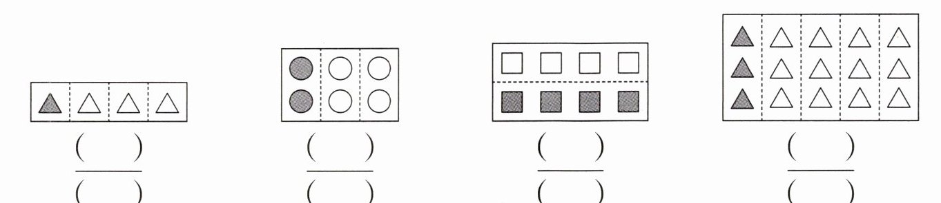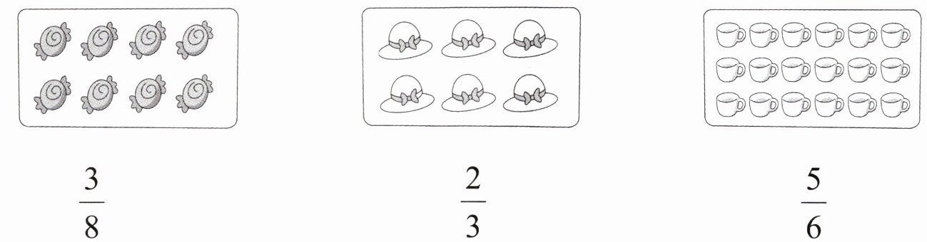 1. 第一幅图:8个糖果中圈出3个表示$\dfrac{3}{8}$。