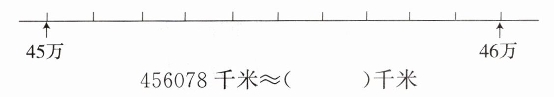 (2)依据我国现行的标准,中型出租客运汽车在行驶里程达到 50 万千米时就要报废。一辆出租车已经行驶了 456078 千米,请你在数线图上标一标,再四舍五入到万位。