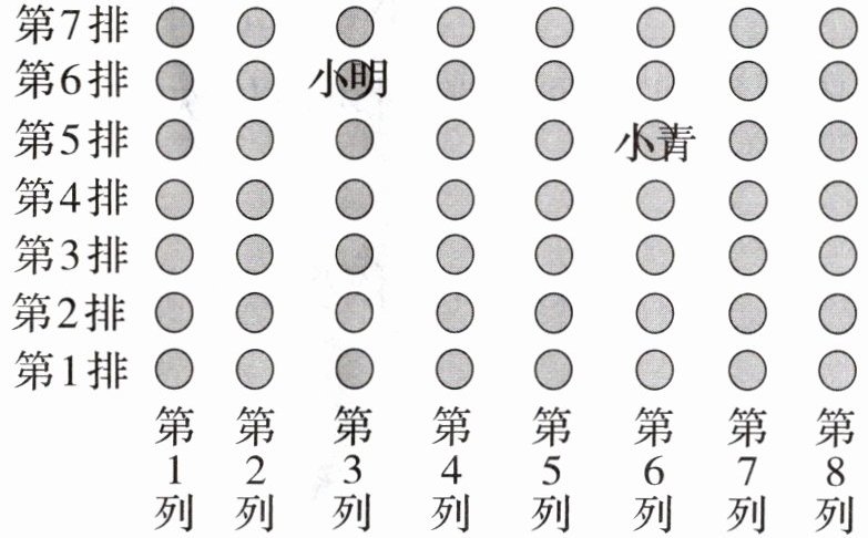 。(2)小华的位置用数对表示是$(4,5)$,小晴的位置用数对表示是$(6,4)$,在下图中标出他们的位置,并说一说他们分别坐在第几列,第几排。