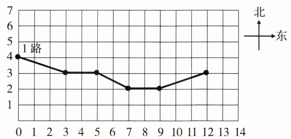 (2)2路公交车从西向东的行驶路线是(0,0)→(0,2)→(5,1)→(7,2)→(9,3)→(12,4),1路公交车和2路公交车可以在(
