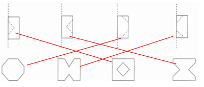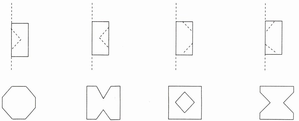 像下面四幅图那样沿虚线剪下,剩下的纸打开后是什么图形?与第二行的图形连一连。