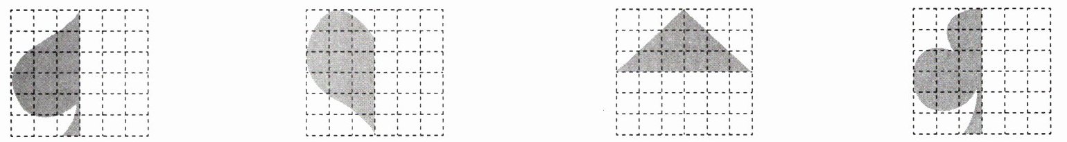 第一个:以中间竖线为对称轴,在右侧对应位置描出与左侧形状相同的部分,可得到一个类似黑桃形状的完整轴对称图形。
