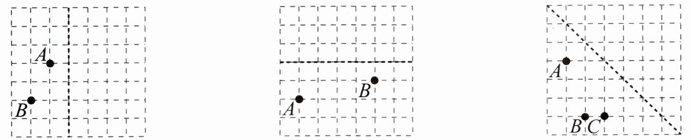 点$A$:点$A$到竖直虚线的水平距离为$2$格,那么它关于竖直虚线的对称点到竖直虚线的水平距离也为$2$格,且在竖直虚线的右侧,据此可画出$A$的对称点。