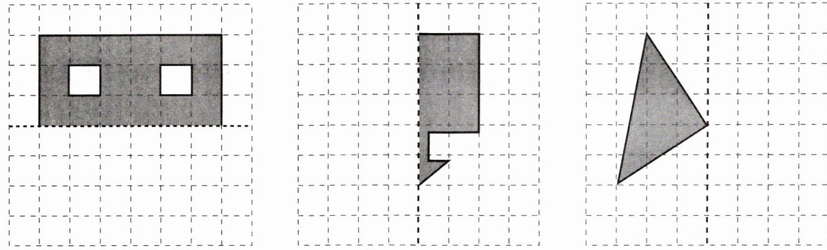 第一个图形**:这是一个带有两个小正方形缺口的大长方形,以水平虚线为对称轴。先找出大长方形的四个顶点以及两个小正方形的顶点关于水平虚线的对称点。例如大长方形的顶点,设原顶点坐标(假设以网格左下角为原点建立坐标系),根据对称点到对称轴距离相等的性质,求出对称点坐标。