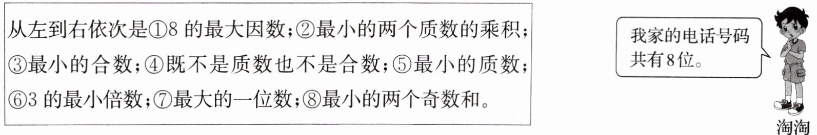 从左到右依次是①8 的最大因数;②最小的两个质数的乘积;③最小的合数;④既不是质数也不是合数;⑤最小的质数;⑥3 的最小倍数;⑦最大的一位数;⑧最小的两个奇数和。