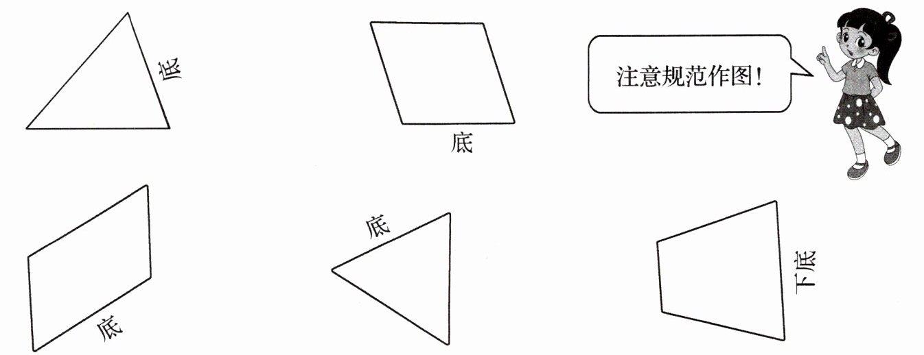 梯形(第五个图)**:用三角板的一条直角边与梯形的下底重合,另一条直角边向上底平移,过上底的一点(任意一点均可)作垂线,这点与垂足之间的线段就是该梯形下底上的高。