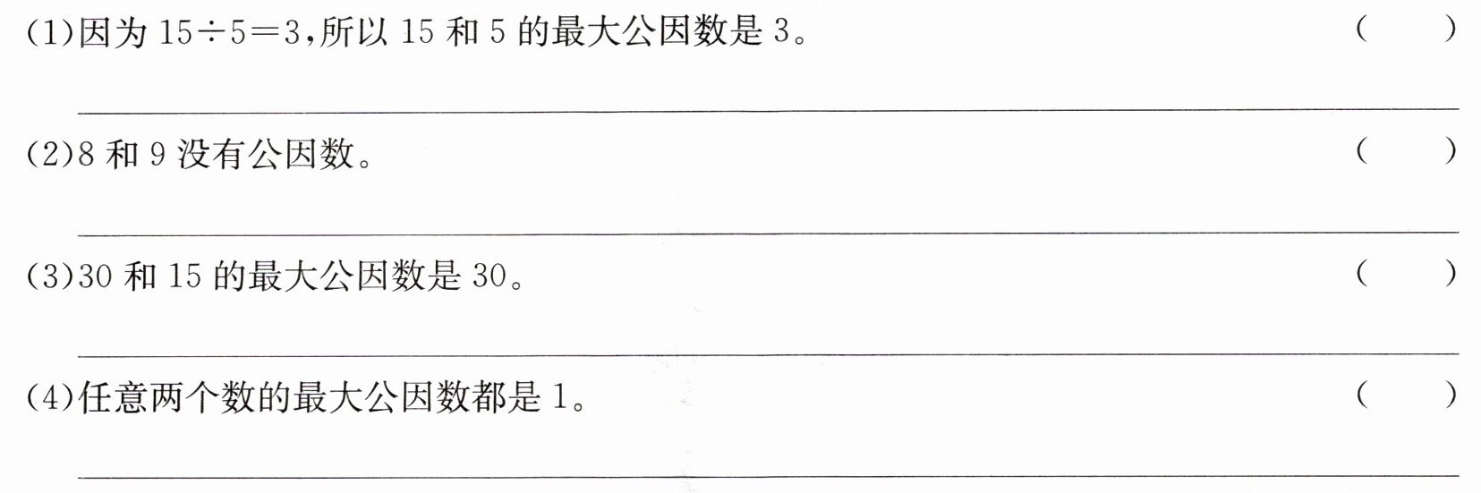 判断理由:因为$15÷5 = 3$,说明$15$是$5$的倍数,当两个数是倍数关系时,较小数就是这两个数的最大公因数,所以$15$和$5$的最大公因数是$5$,而不是$3$。