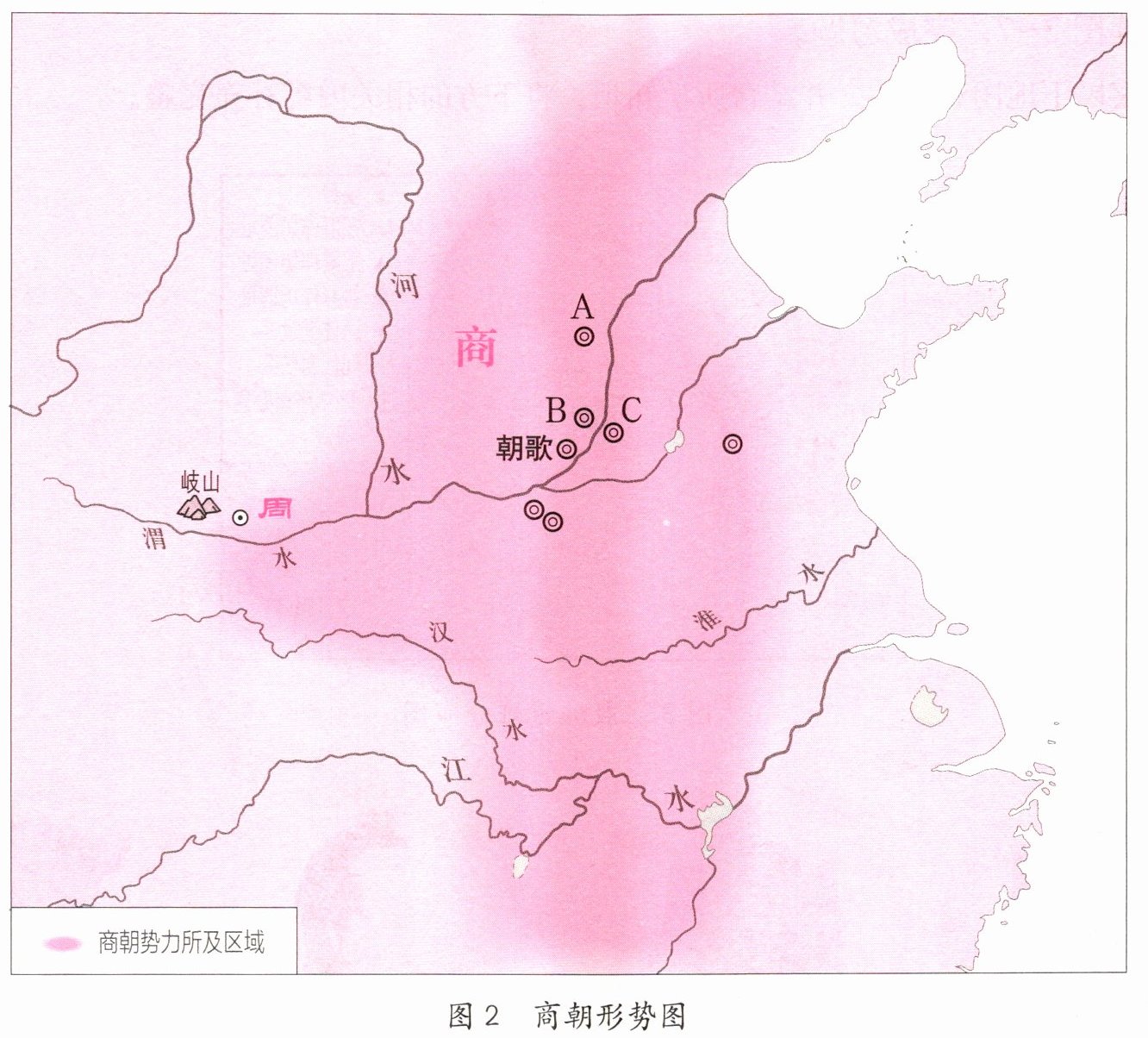 (3) 结合所学知识,在图2中描画出商朝鼎盛时期的势力所及区域。