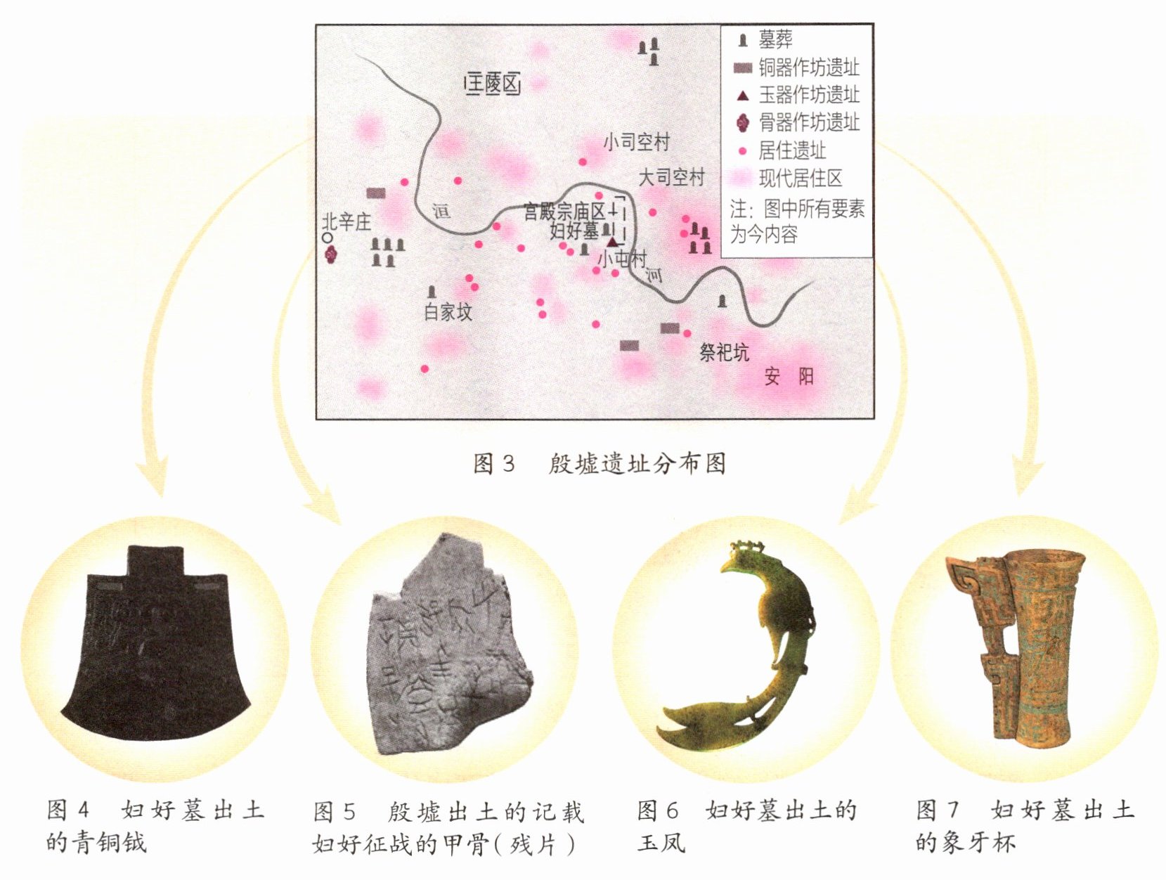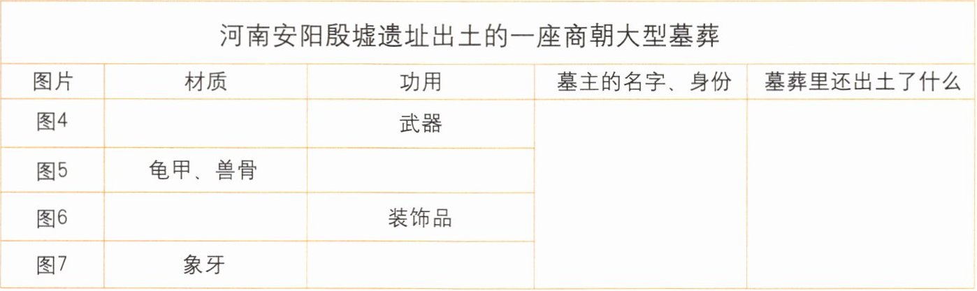 3.材质:图4为青铜,图6为玉石;功用:图5为占卜、记事,图7为饮酒器 名字:妇好;身份:商王武丁的王后、女将军、大祭司;出土:车马、殉葬的奴隶等;图3按叙述依次为:大型宫殿 作坊 手工业