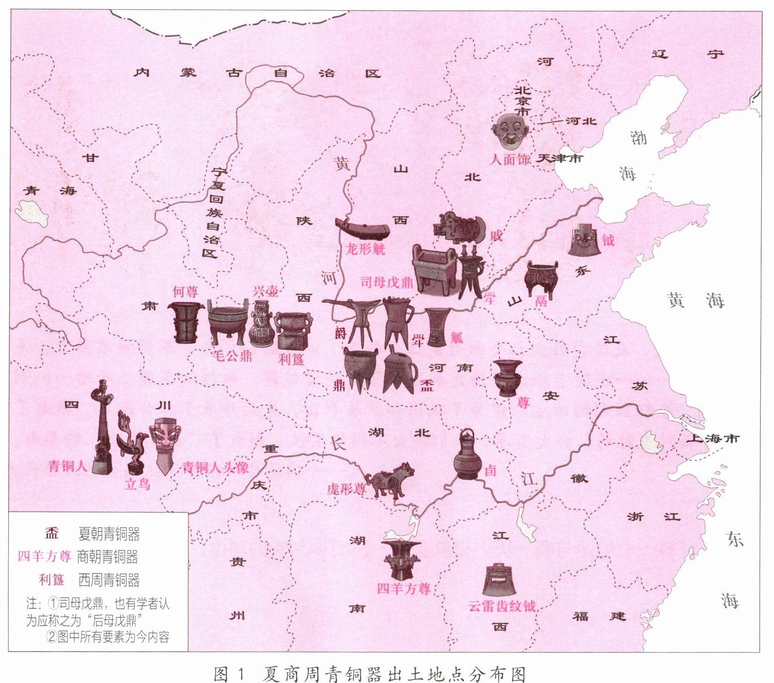 省西部地区。(3) 根据图 1,指出图中青铜器的分布特点,并分析这种特点的成因。