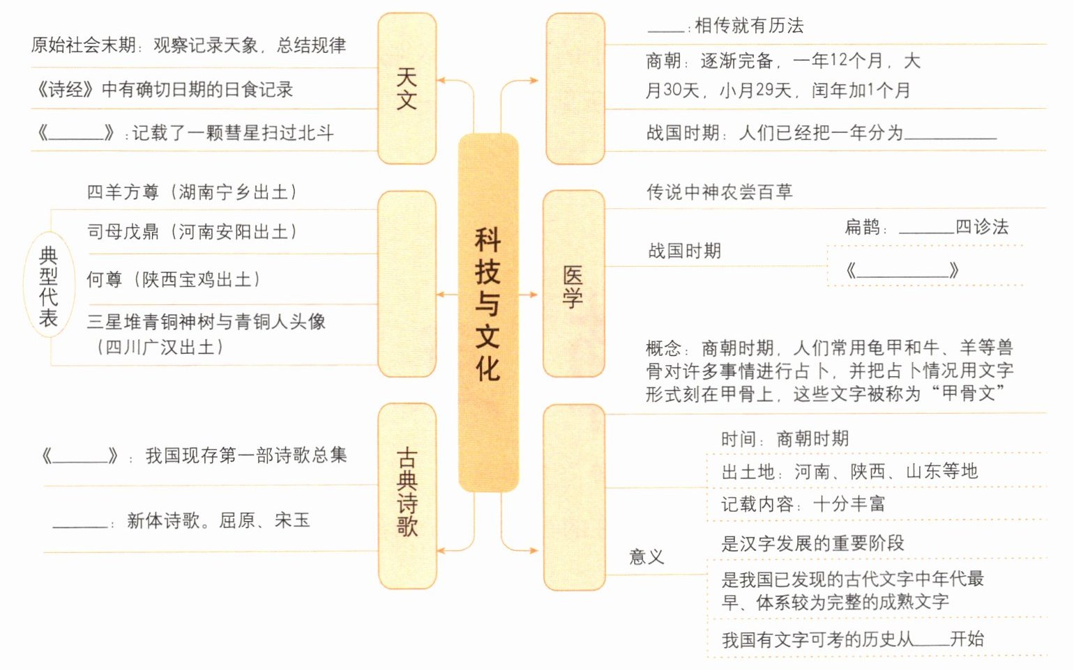 5.自上而下、自左而右分别为:春秋 诗经 楚辞 青铜器 历法 甲骨文 夏朝 二十四节气 望、闻、问、切 黄帝内经 商朝