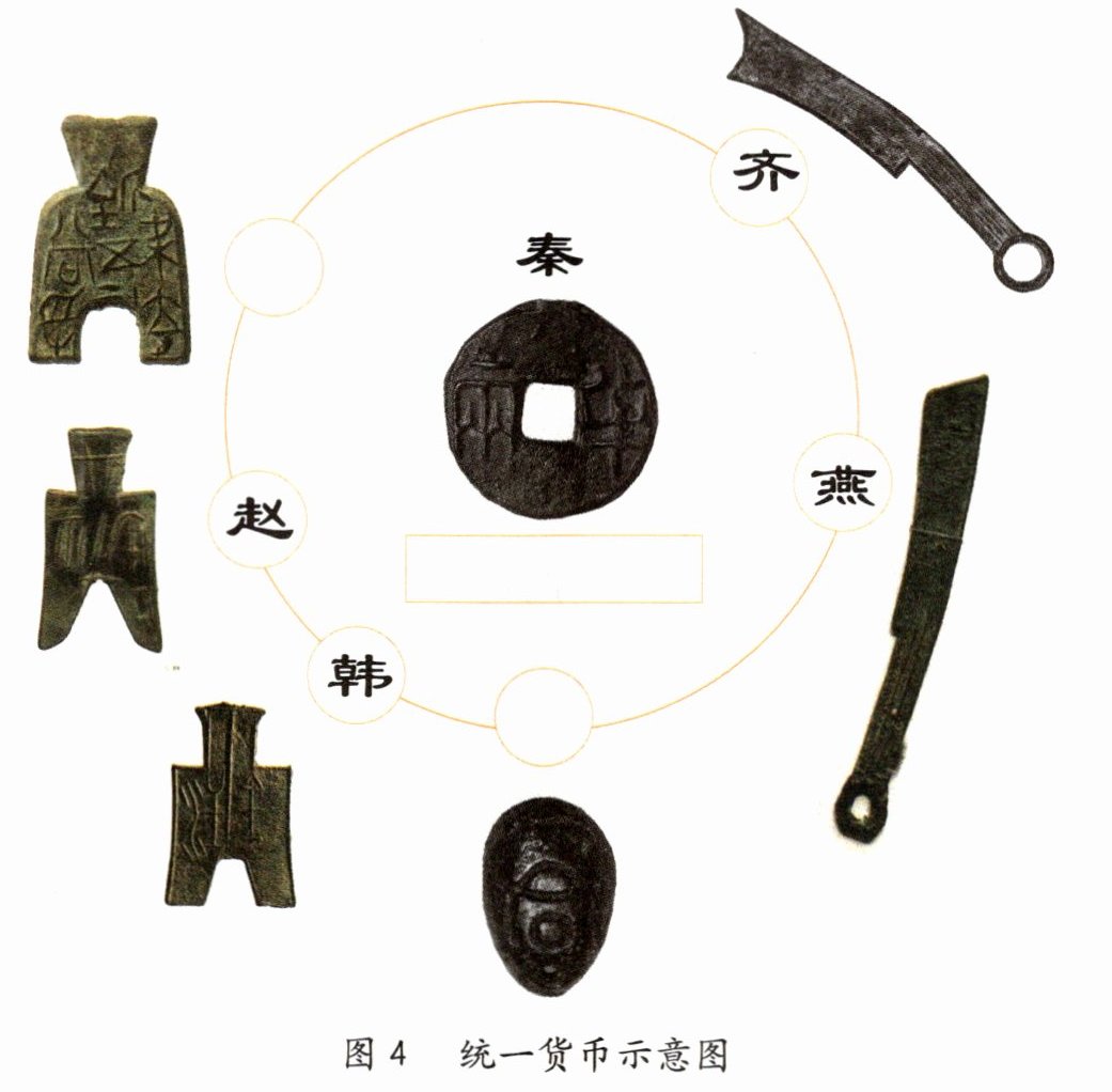 4.(1)国名自上而下分别为:魏 楚 统一货币的名称:圆形方孔半两钱 (2)货币的统一,改变了以往币制混乱的状况,有利于国家对经济的管理,促进各地经济的交流。