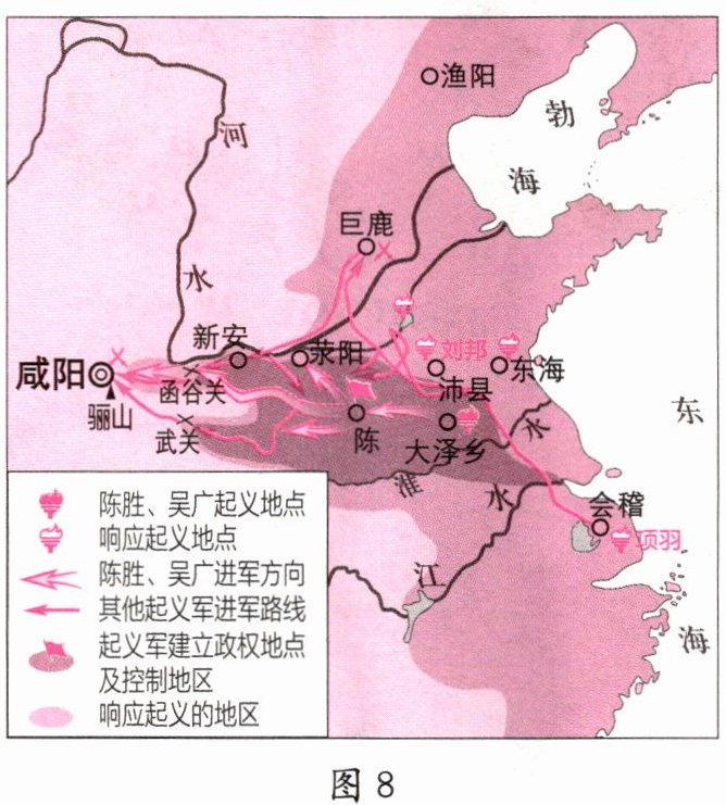 (3) 图 8 中出现的一位历史人物曾振臂一呼,喊出“王侯将相宁有种乎!”的口号。你如何理解这句话?