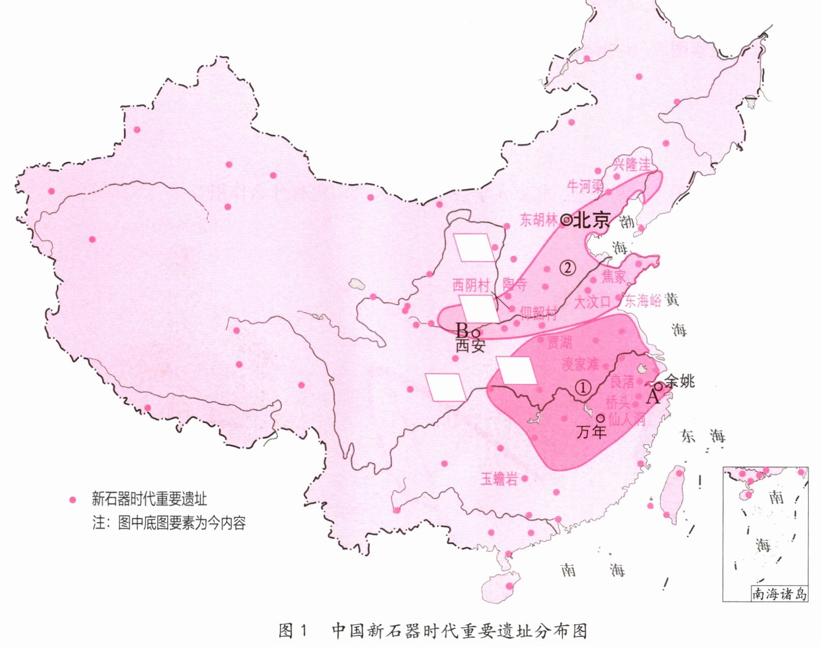 (5) 请在图 1 中相应处用红笔圈出东胡林遗址、大汶口遗址、仰韶遗址等新石器时代的重要遗址。