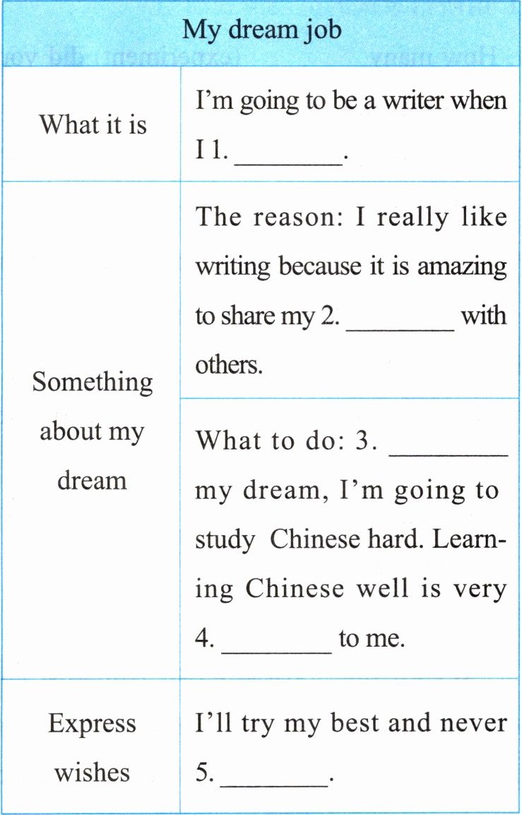 世界上最快乐的事,莫过于为梦想而奋斗。相信每一个人都有自己的梦想工作。请阅读下面短文,根据短文内容完成表格,掌握短文结构及写作思路。
