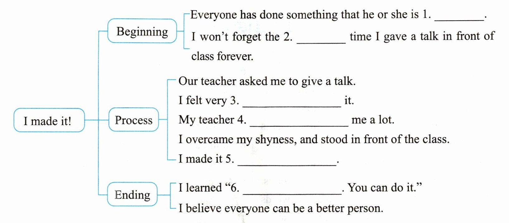 1. proud of 2. first 3. nervous about 4. encouraged 5. at last 6. Believe in yourself