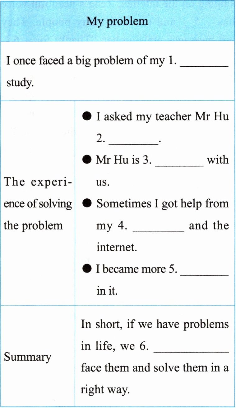I once faced a big problem of my physics study. I found it difficult to get high grades. I asked my teacher Mr Hu for help. Mr Hu is strict with us. At first, I was afraid to do that. Later, Mr Hu asked me if I had a problem after class. I was so glad to get my teacher’s help. Sometimes I got help from my classmates and the internet. Gradually, my physics improved, and I became more confident in it.