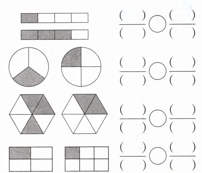 $\frac{1}{4}<\frac{3}{4}$ $\frac{1}{3}>\frac{1}{4}$ $\frac{3}{6}>\frac{2}{6}$ $\frac{1}{4}>\frac{1}{6}$