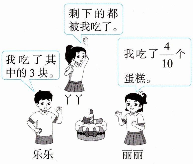 6. 丫丫在她生日那天邀请好朋友乐乐和丽丽一起吃蛋糕,他们把一个蛋糕平均分成了10块,乐乐和丽丽一共吃了这个蛋糕的几分之几?