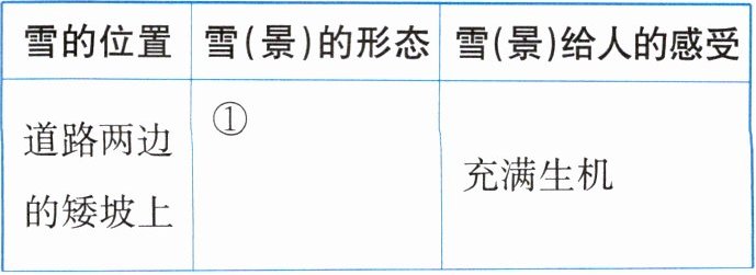 ①结合题干“雪的位置道路两边的矮坡上”“雪(景)给人的感受充满生机”根据第⑤段可知雪(景)的形态是“茸茸的”