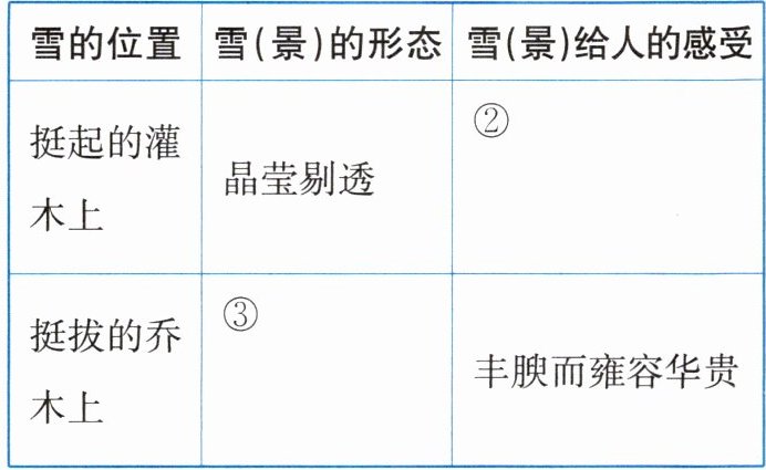 ②结合题干“雪的位置挺起的灌木上”“雪(景)的形态晶莹剔透”根据第⑥段可知雪(景)给人的感受是“水灵可爱”
