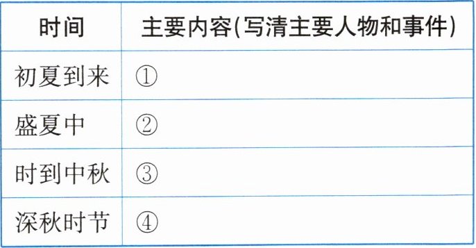 2.①孩子们把柿子花项链挂在颈项上。 ②父亲用青柿子油浸染麻线网。 ③孩子们敲早熟的红柿子。 ④大人们收熟柿子。 解析:本题考查对文章内容的梳理概括。根据首段“有许多女生,将那串串柿子花当成项链挂在颈项上,更显秀气乖巧”可概括出,①处应为:孩子们把柿子花项链挂在颈项上。根据第②段“等柿子如鸡蛋般大小……浸染麻线网”可概括出,②处应为:父亲用青柿子油浸染麻线网。根据第③段“我们还备起了十多米长的细竹竿,专门用来敲红柿子”可概括出,③处应为:孩子们敲早熟的红柿子。根据第④段“到了深秋时节……照顾树下几十张馋嘴”可概括出,④处应为:大人们收熟柿子。