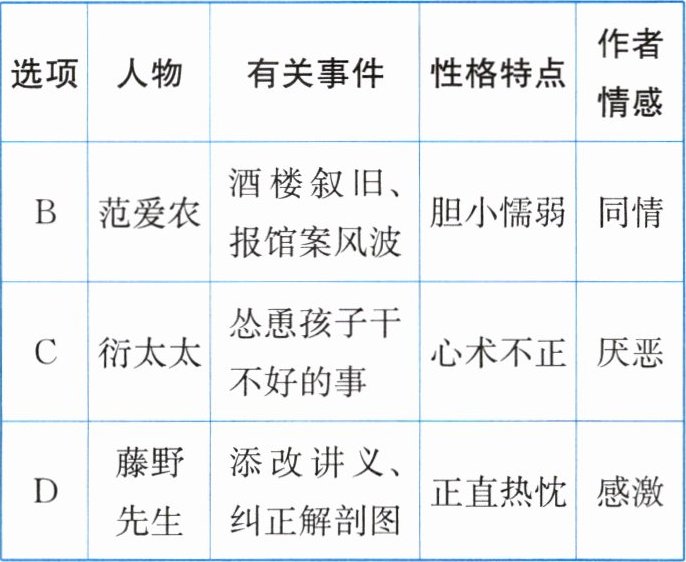 5.小明对《朝花夕拾》部分篇章的内容进行了梳理,下面表格中表述不完全正确的一项是(_______)(2分)