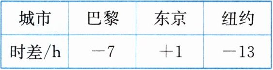 (1)解:巴黎与北京的时差为$-7h$,即巴黎时间比北京时间晚$7h$。