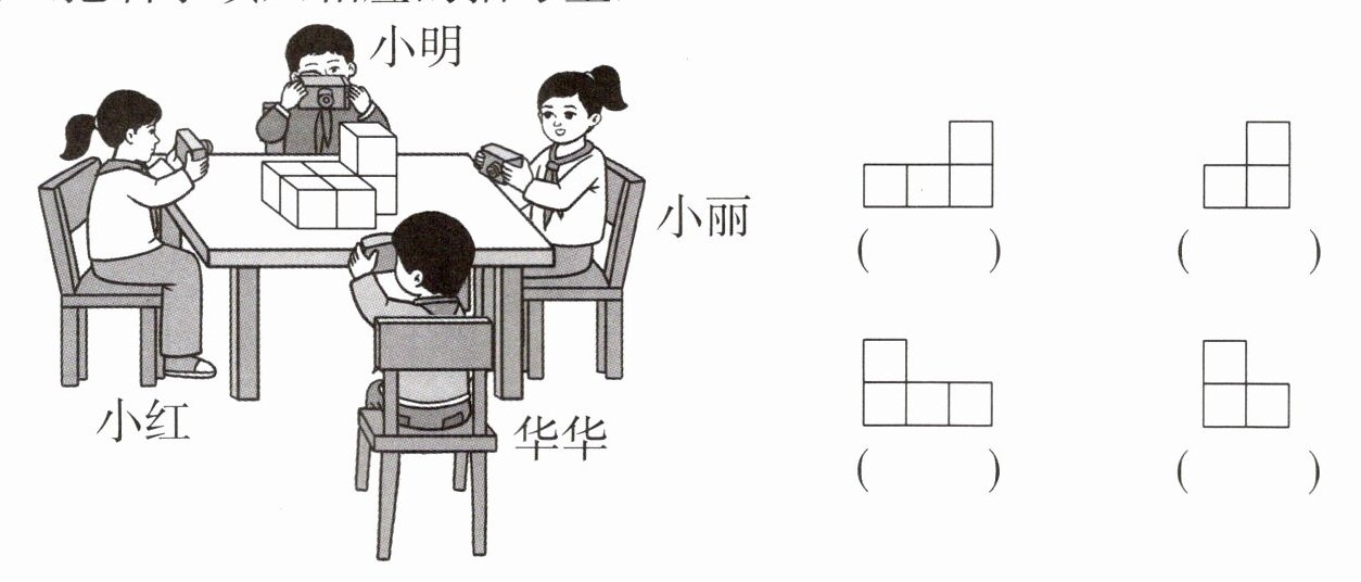 7. 小明、小红、小丽、华华四名同学给物体拍照,请指出他们四人各拍到的是哪张照片。(把名字填入相应的括号里)