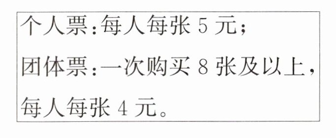 购个人票:5×(1+7)=40(元)(或5×1+5×7=40(元))购团体票:4×(1+7)=32(元)(或4×1+4×7=32(元))40>32 40-32=8(元)买团体票更便宜,便宜了8元。