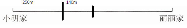 6. 如图,小明从家出发,去丽丽家玩,4 分钟走了 250 米,再走 140 米就走了一半了。小明家到丽丽家一共有多少米?(先画图,再解答)