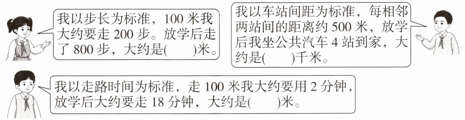 3. 估一估下面的小朋友从学校到家的距离,填一填。