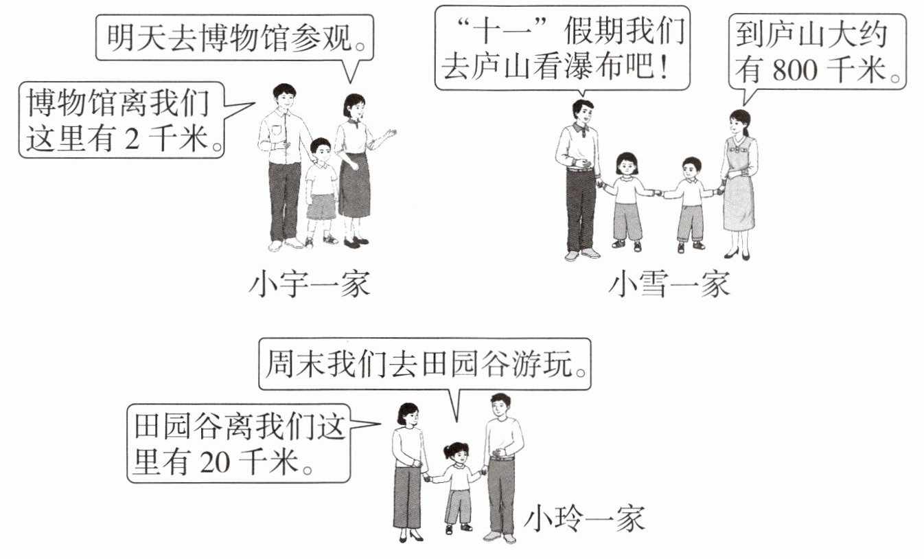 提示:小宇一家去博物馆,距离2千米,可以步行,大约20分钟。小雪一家去庐山,距离800千米,可以乘飞机,大约1小时,也可以坐动车,大约3小时。小玲一家去田园谷,距离20千米,可以驾车,大约半小时。
