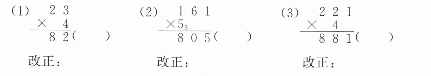 3. 判断下列竖式是否正确,正确的在( )里画“√”,错误的画“×”并改正。