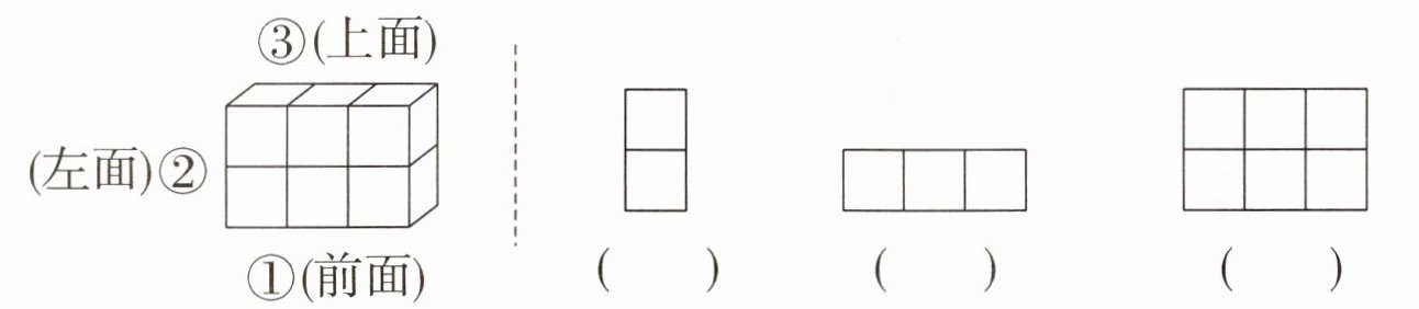 1. 右边的三幅图分别是从哪个位置看到的?把相应的序号填在括号里。