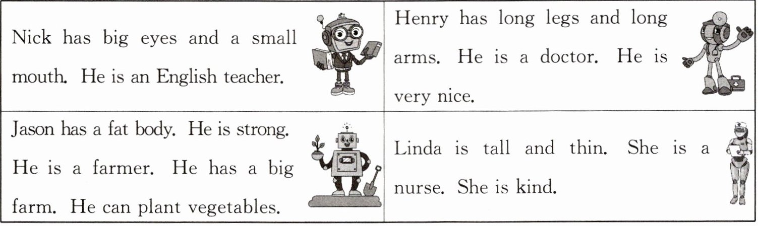 | Nick has big eyes and a small mouth. He is an English teacher. || Henry has long legs and long arms. He is a doctor. He is very nice. ||