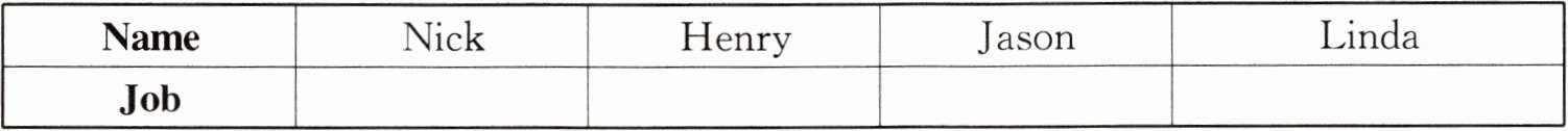 $\begin{array}{|c|c|c|c|}\hline Name & Nick & Henry & Jason & Linda \\ \hline Job & & & & \\ \hline \end{array}\\ \hline $