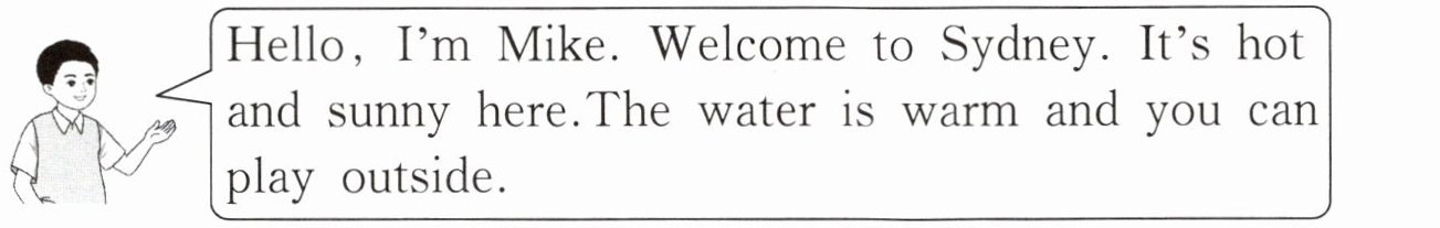 Hello, I'm Mike. Welcome to Sydney. It's hot and sunny here.The water is warm and you can play outside.