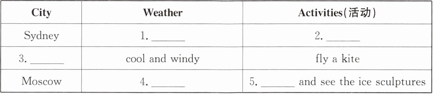 | Moscow | 4. ______ | 5. ______ and see the ice sculptures |