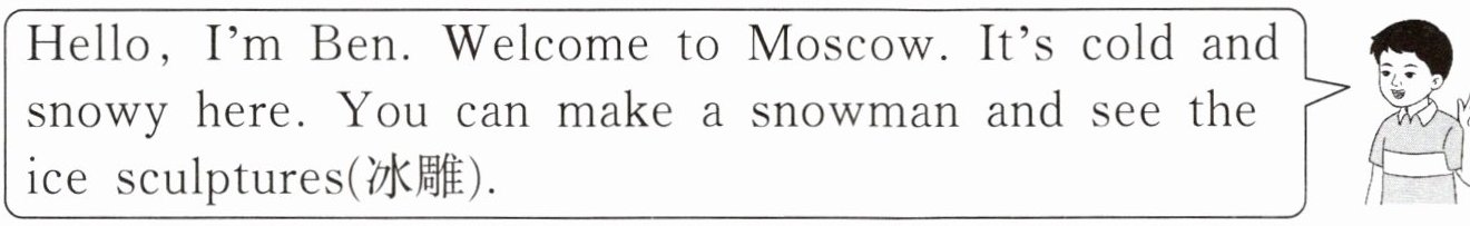 Hello, I'm Ben. Welcome to Moscow. It's cold and snowy here. You can make a snowman and see the ice sculptures(冰雕).