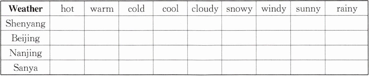| Weather | hot | warm | cold | cool | cloudy | snowy | windy | sunny | rainy |