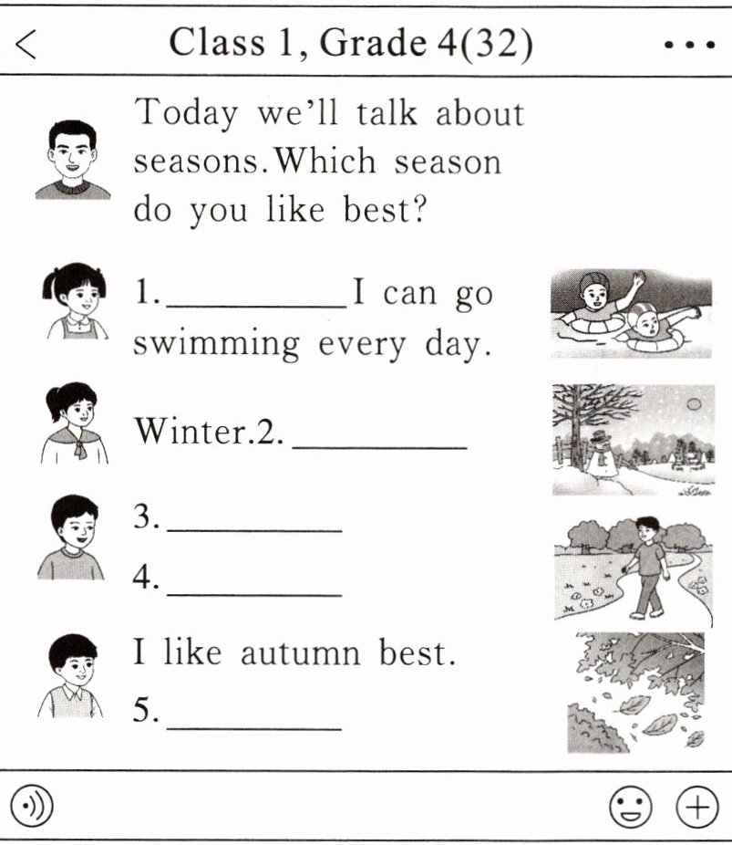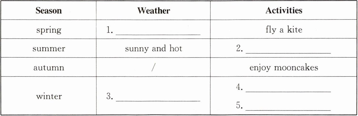 There are four seasons in a year. I do different things in different seasons. In spring, it's warm and windy. I can fly a kite when it's windy. Summer is sunny and hot. I can swim in the pool every day. It can make me strong. Autumn is orange. The leaves fall and fall and fall. I can enjoy mooncakes. In winter, it's cold and snowy. I can play in the snow and make a snowman. I like winter best.
