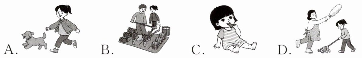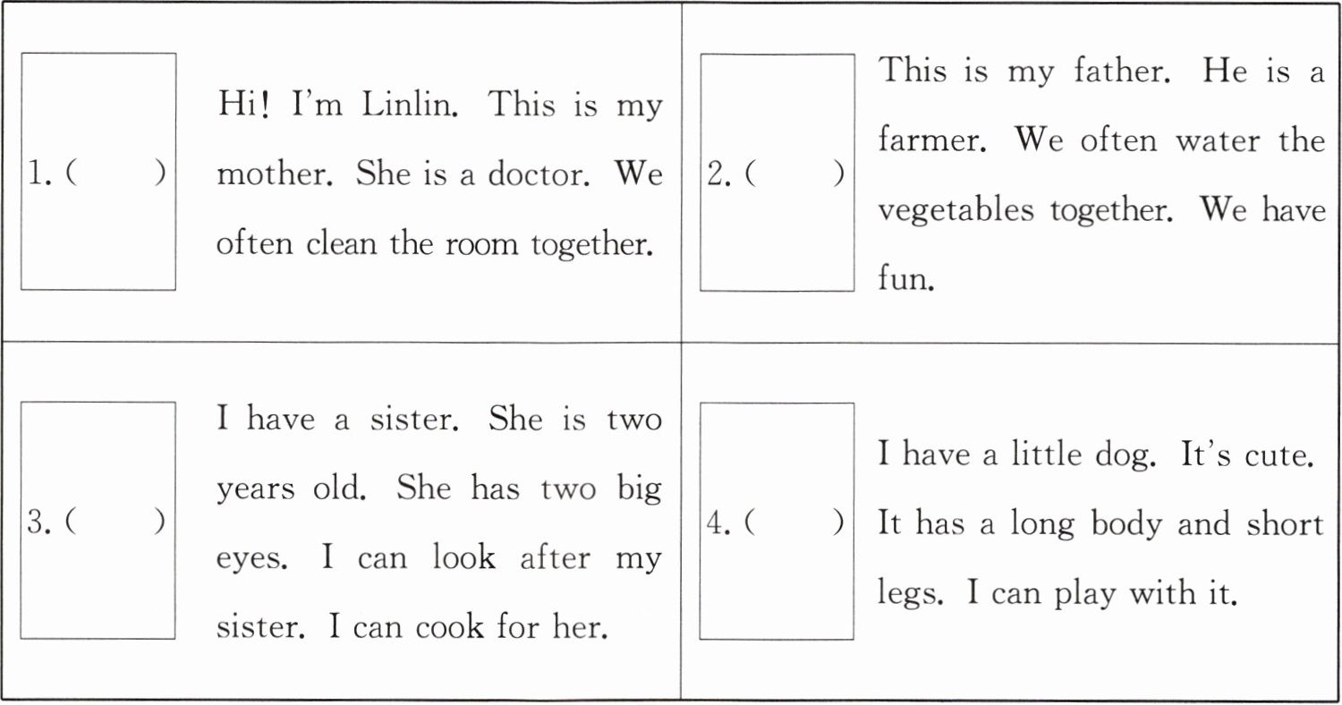 | 3.( ) | I have a sister. She is two years old. She has two big eyes. I can look after my sister. I can cook for her. | 4.( ) | I have a little dog. It’s cute. It has a long body and short legs. I can play with it. |